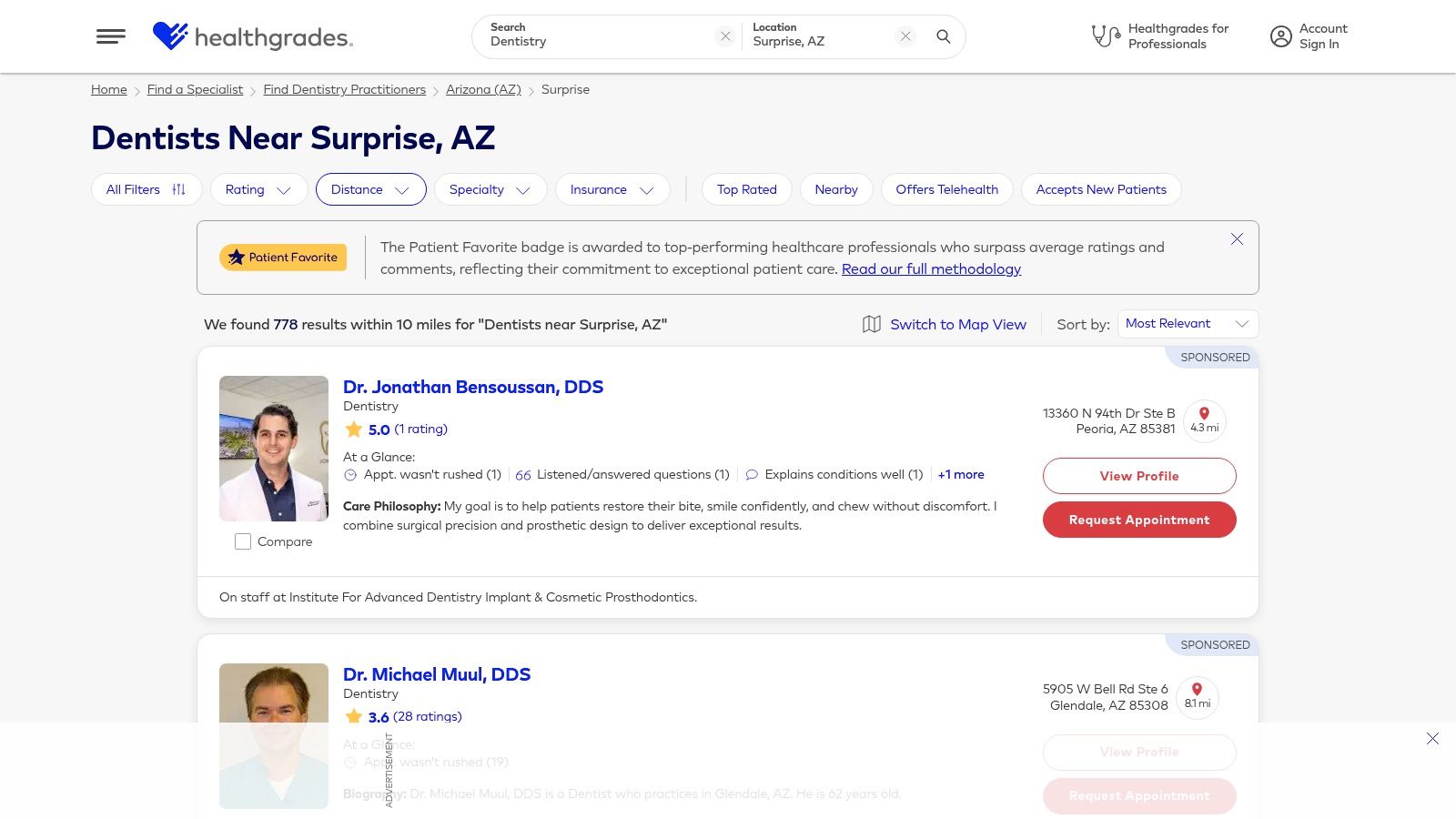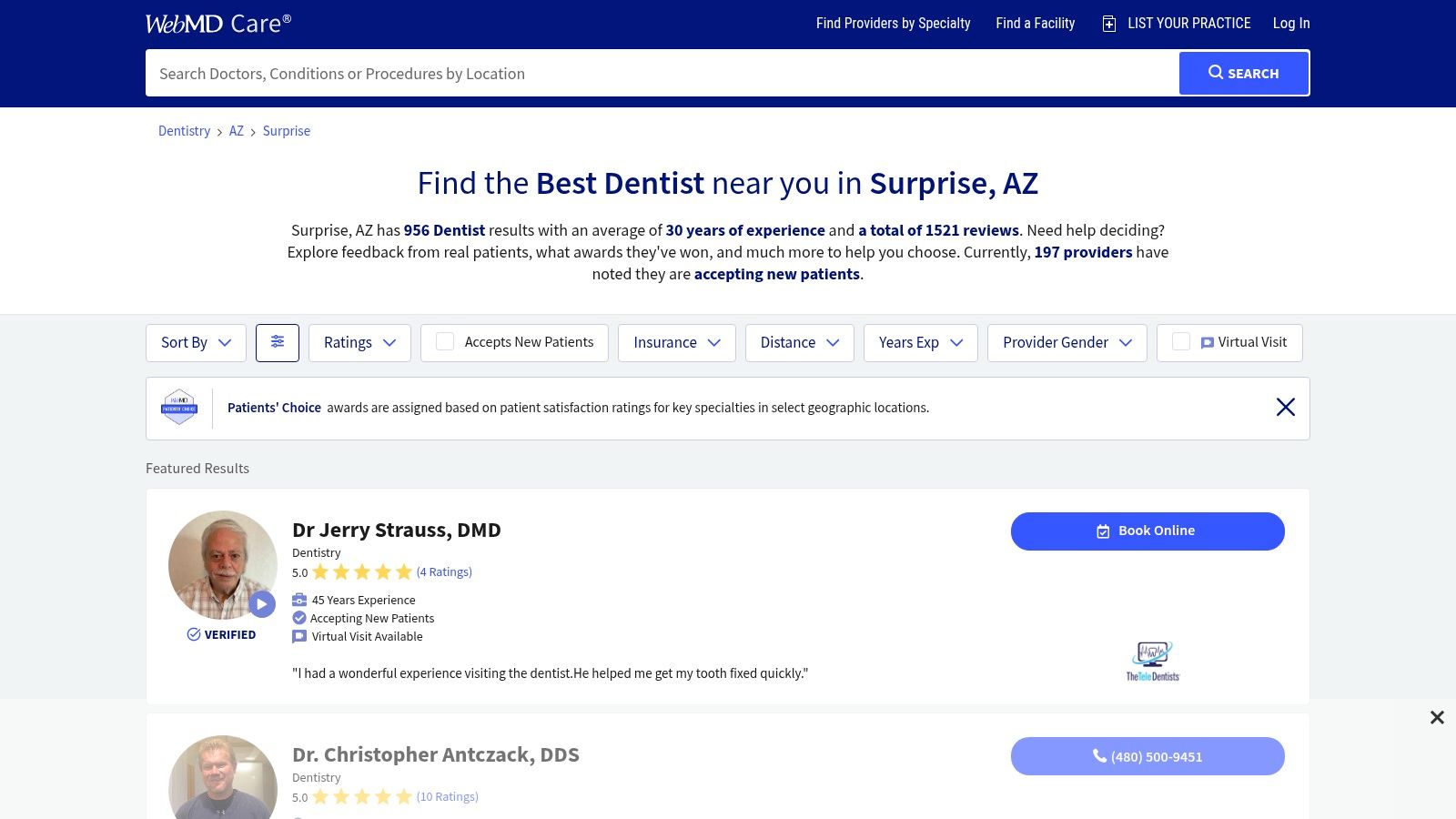 Healthgrades is best for creating a shortlist of potential dentists. Start by searching for dentists in Surprise, AZ, and then use the filters to narrow the results.