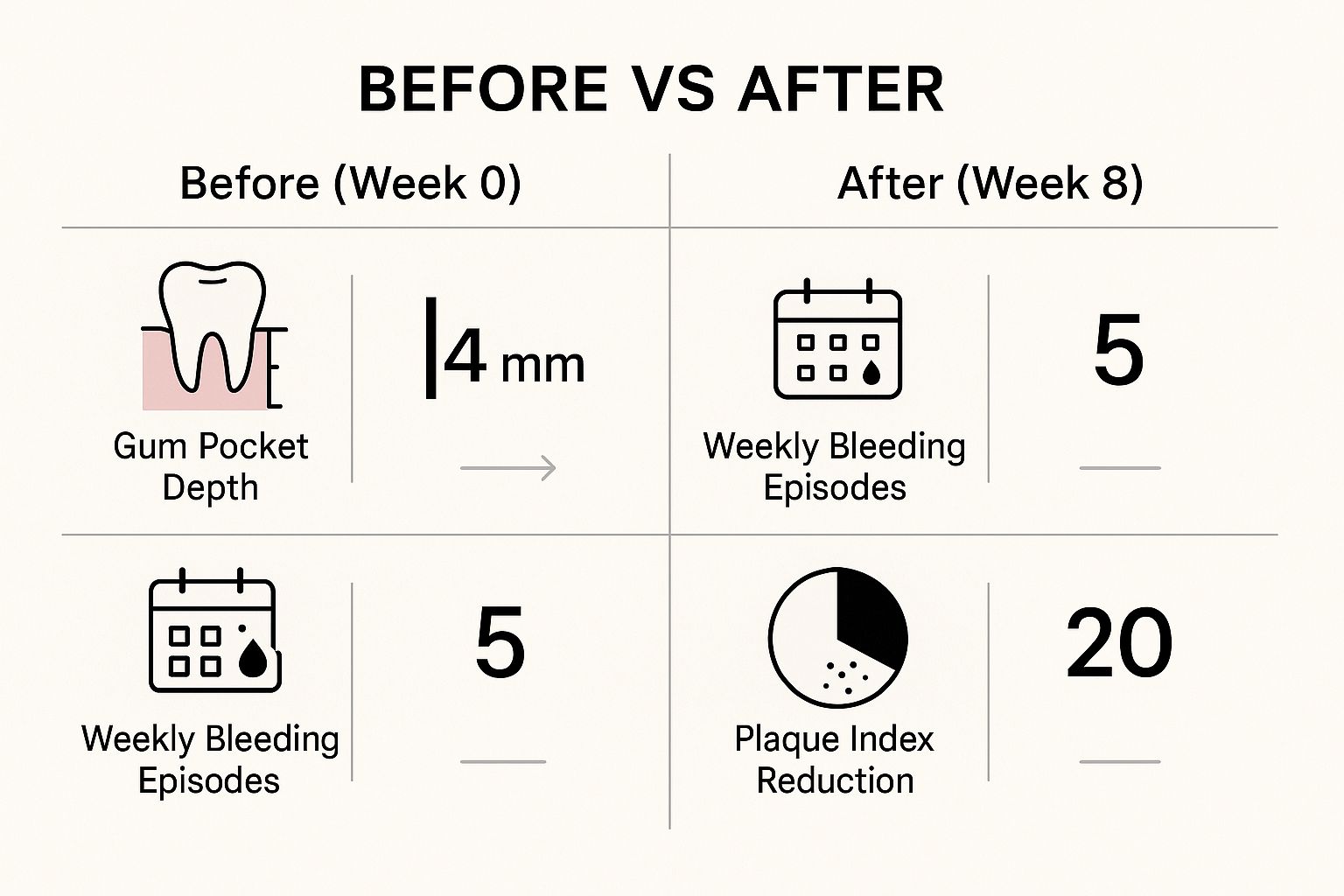 As you can see, a dedicated routine can lead to much less bleeding, plaque, and pocket depth. These are all key signs that your gums are healing.