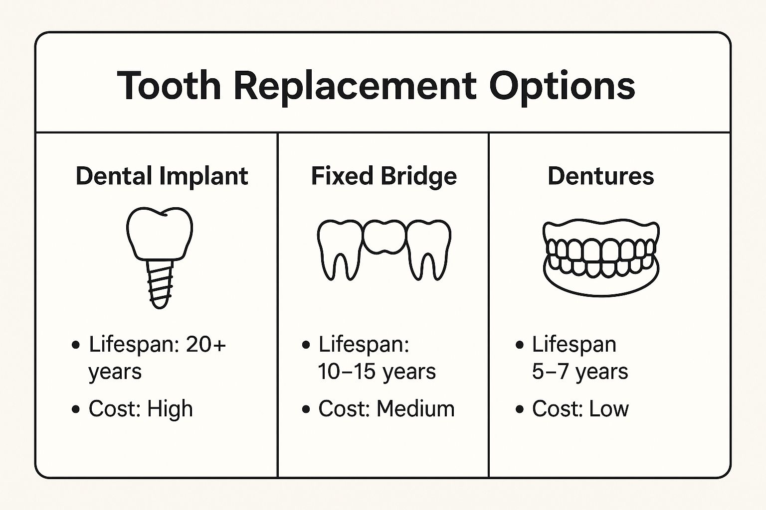 Your dentist will suggest the best solution for your situation. Each choice has different benefits, costs, and care needs. It's important to replace a missing tooth quickly to prevent other teeth from shifting and to avoid bone loss in your jaw.