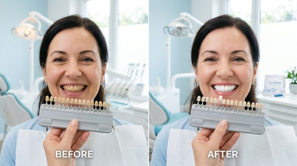 A commonly cited range for professional in-chair whitening is about 4 to 8 shades in 60 to 90 minutes, while tray systems usually produce 2 to 6 shades over a longer period, according to teeth whitening effectiveness and sensitivity data. That doesn’t mean every patient gets the same change, but it does explain why people choose this route before weddings, interviews, reunions, or photos.