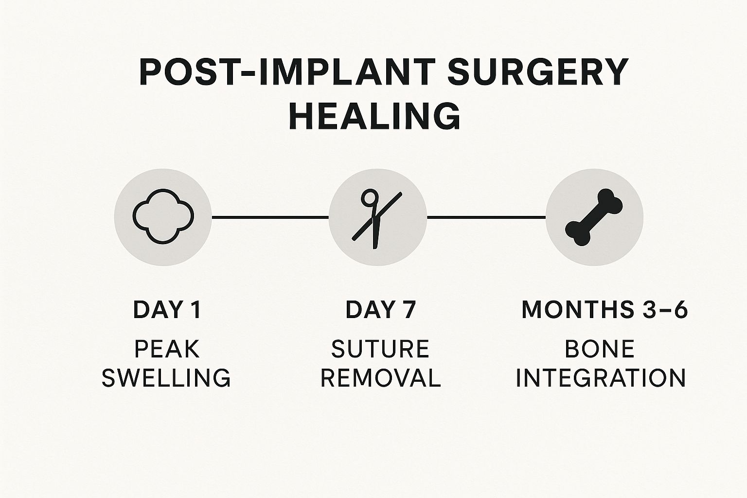 You can expect a few days of healing with some mild discomfort and swelling. After that, there's a longer period of 3-6 months where the implant fuses with your jawbone. This guide will walk you through the dental implant recovery timeline.