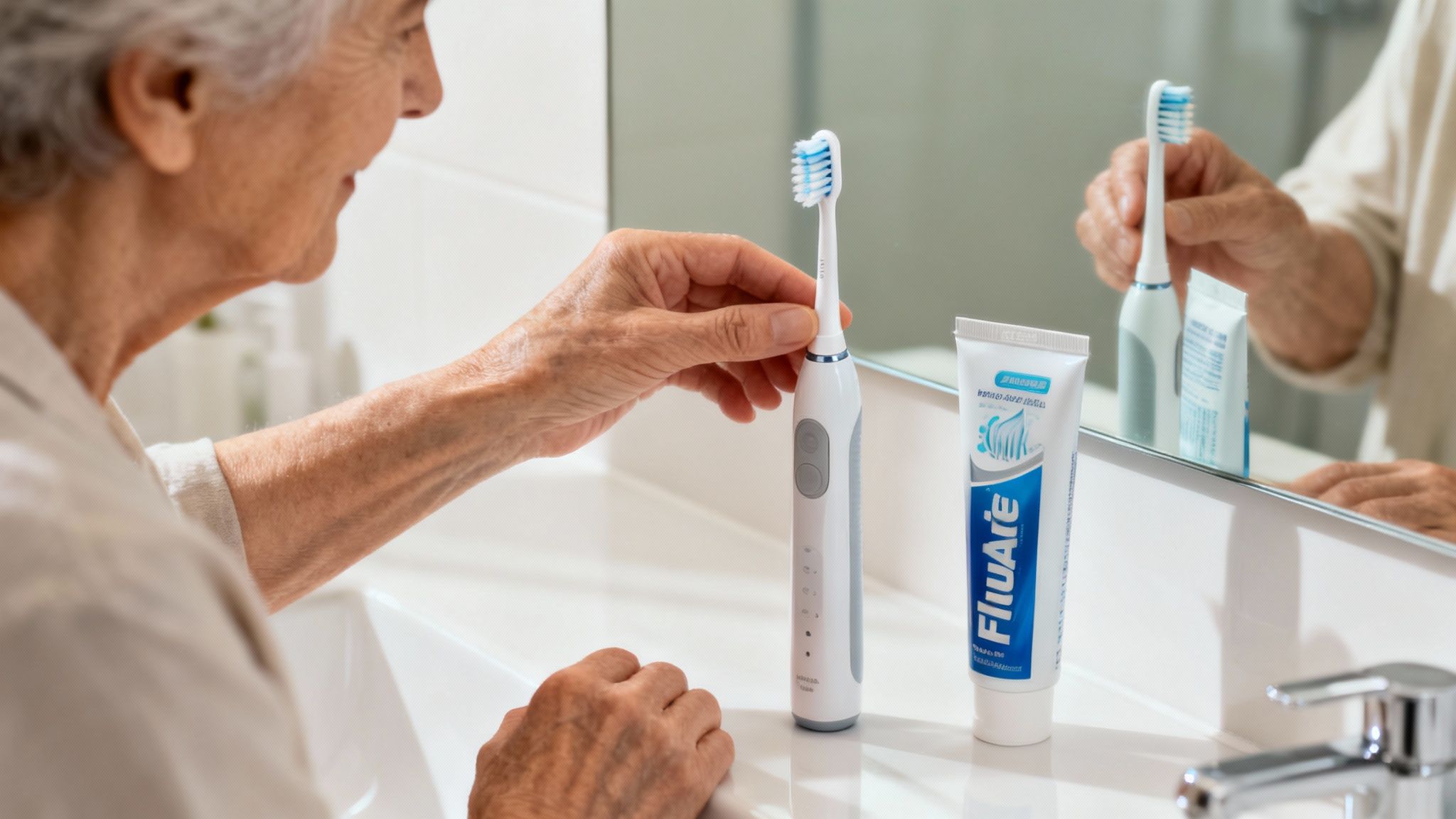 - Upgrade Your Toothbrush: Use a soft-bristled brush to protect sensitive gums. If holding a brush is difficult, an electric toothbrush with a larger handle can provide a better grip and a more effective clean.